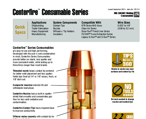 The Centerfire™ Thread-On Nozzle (Large) is designed to enhance your welding experience. Featuring a 3/4" bore size and a 1/8" recess, this brass nozzle is available in a convenient package of 10. Engineered specifically for Bernard MIG Guns, it ensures optimal performance and durability in your welding tasks.