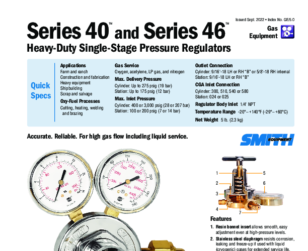 Built for versatility, this regulator features a robust stainless steel diaphragm. Unlike standard rubber diaphragms, stainless steel offers superior resistance to corrosion and temperature fluctuations, making this unit suitable for use with liquid (cryogenic) gases. The all-brass construction, paired with a nickel-plated bonnet, stands up to corrosive atmospheres common in heavy manufacturing, shipyards, and construction sites. Operators will appreciate the large, 2.5-inch brass gauges equipped with shatter-resistant polycarbonate lenses, which provide clear and safe pressure readings even in rugged conditions. Whether you are managing manifold gas feeds, heating applications, or heavy equipment manufacturing, the Smith 40-50-510 delivers the durability and precision required for critical tasks.