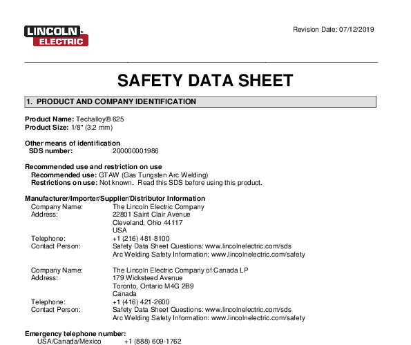 Lincoln Techalloy 625 1/8 10 lb Tube (GTAW)
