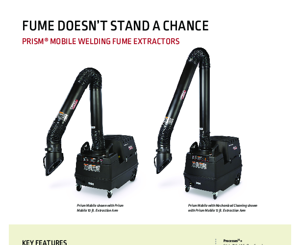 The Prism Mobile product family offers efficient welding fume extraction and filtration. Designed for smaller manufacturing facilities, these low vacuum systems are perfect for light to medium duty operations in various locations. Please note that they are not suitable for cutting or arc gouging.