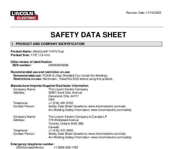 The UltraCore® 71A75 Dual by Lincoln Electric is a versatile wire designed for general purpose applications. It offers the convenient option of using either straight CO2 or a combination of 75% Argon and 25% CO2 gas. With this wire, you can achieve a stable arc, minimal spatter, and a polished bead appearance for various fabrication needs.